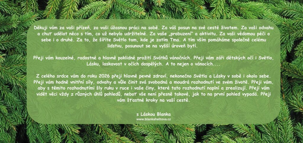 Do roku 2026 vám pak přeji hlavně pevné zdraví, nekonečno Světla a Lásky v sobě i okolo sebe. Přeji vám hodně vnitřní síly, odvahy a vůle činit svá svobodná a moudrá rozhodnutí ve svém životě. Přeji vám, aby s těmito rozhodnutími šly ruku v ruce i vaše činy, které tato rozhodnutí naplní a zrealizují. Přeji vám nádherné okamžiky ztišení sami se sebou. Přeji vám vidět věci vždy z různých úhlů pohledů, neboť vše není přesně takové, jak to na první pohled vypadá. Přeji vám šťastné kroky na vaší cestě.